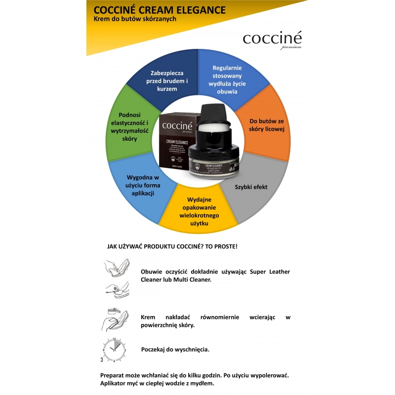 Coccine Pielęgnujący krem do obuwia ze skóry licowej jest bardzo łatwy w użyciu. Wystarczy nanieść niewielką ilość kremu na czystą, suchą powierzchnię buta, a następnie delikatnie rozprowadzić go równomiernie za pomocą miękkiej szmatki lub gąbki. Po nałożeniu kremu, pozostaw buty na chwilę, aby skóra mogła wchłonąć jego składniki odżywcze. Następnie wystarczy przetrzeć buty suchą szmatką, aby uzyskać połyskujący efekt.