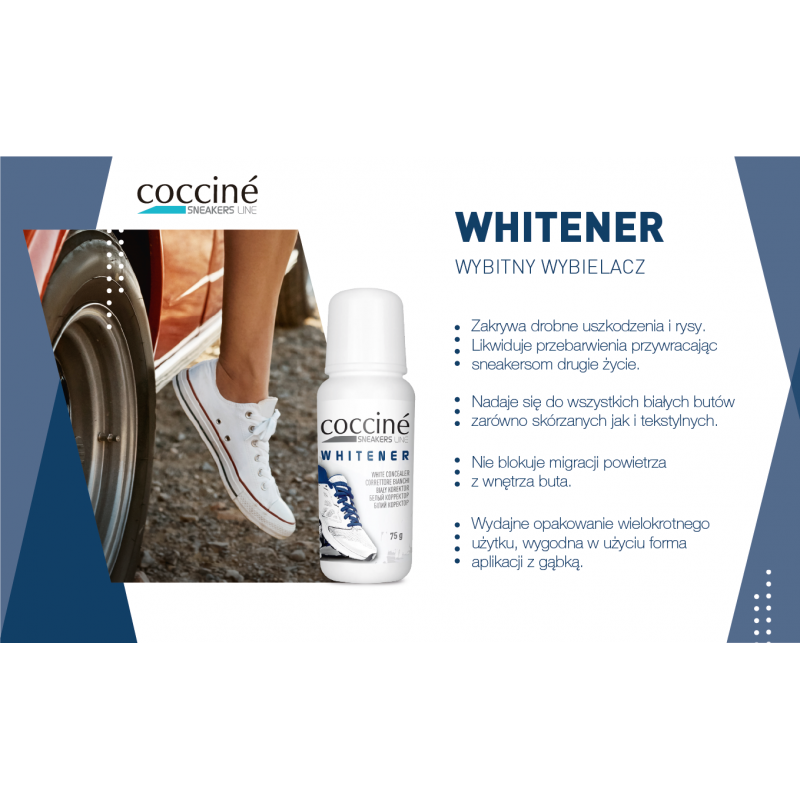 Coccine Wybielacz do butów Sneakers Whitener 75 ml to wysokiej jakości produkt, stworzony specjalnie do odświeżania i wybielania butów sportowych, takich jak sneakersy. Jest idealnym rozwiązaniem dla osób, które pragną przywrócić swoim ulubionym butom ich pierwotny blask i witalność.