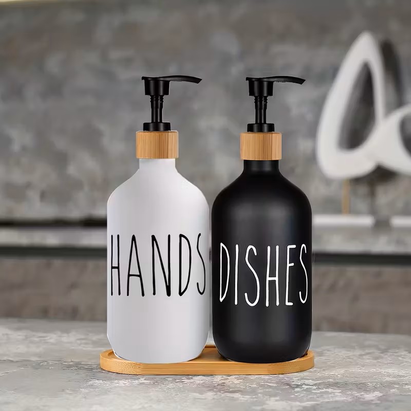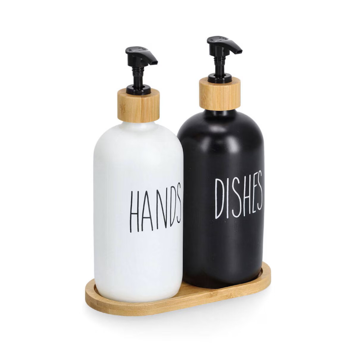 Elegancki zestaw dwóch dozowników z pompką o pojemności 500 ml w kolorze czarnym i białym to stylowe i praktyczne rozwiązanie do kuchni, łazienki lub biura. Idealnie sprawdzą się do mydła w płynie, balsamu, płynu do naczyń oraz środków dezynfekujących. Kontrastowe kolory tworzą nowoczesny, dekoracyjny akcent pasujący do każdego wnętrza.