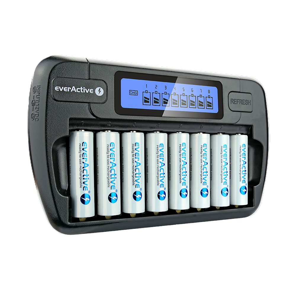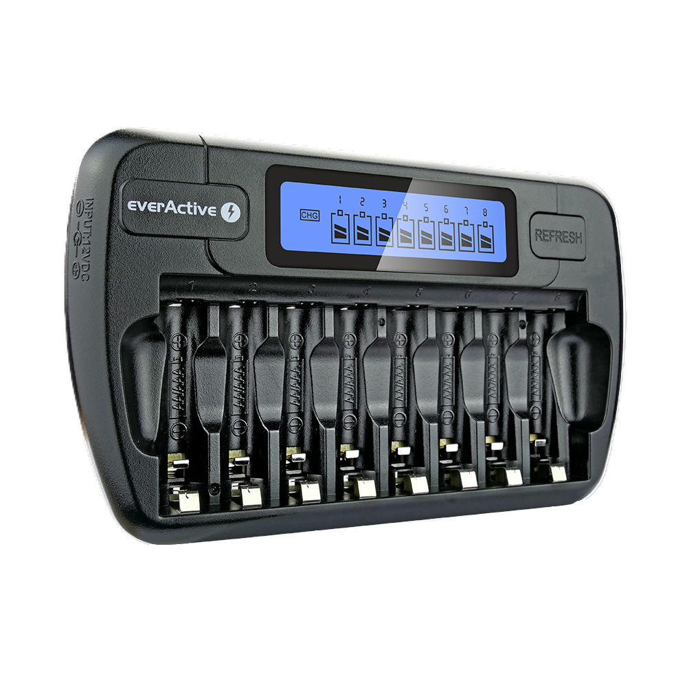 Ładowarka everActive NC 800 oferuje aż 8 niezależnych kanałów ładowania dla akumulatorów Ni-MH w rozmiarach R6/AA lub R03/AAA. Każde ogniwo jest ładowane indywidualnie, co pozwala na ładowanie różnych kombinacji i pojemności akumulatorów od dowolnych producentów.