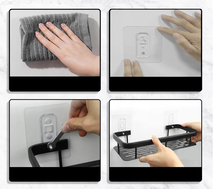 Prostokątny kształt półki zapewnia odpowiednią przestrzeń do przechowywania mydeł, szamponów, gąbek czy innych akcesoriów kąpielowych, dzięki czemu wszystkie niezbędne przedmioty są zawsze pod ręką. Elastyczność montażu na haczykach przylepnych sprawia, że półkę można dostosować do indywidualnych preferencji dotyczących wysokości i lokalizacji.